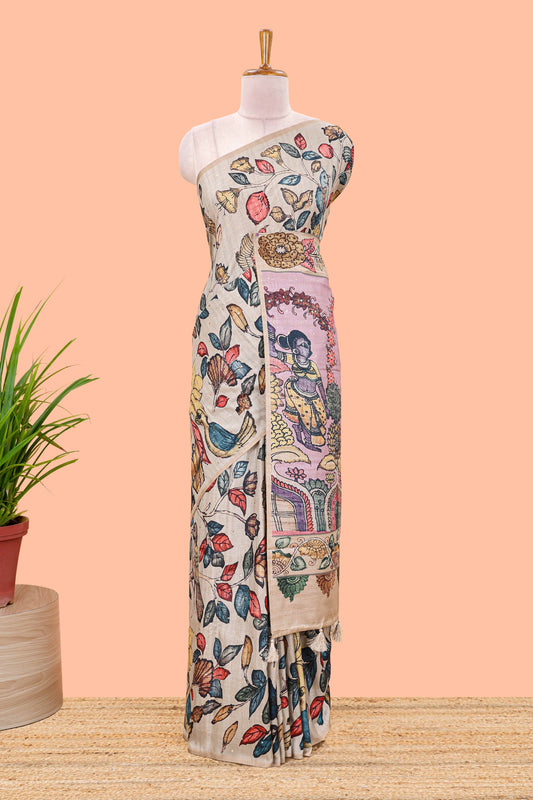 Borderless beige art tussar saree with tree, bird motifs and dancing girl printed pallu