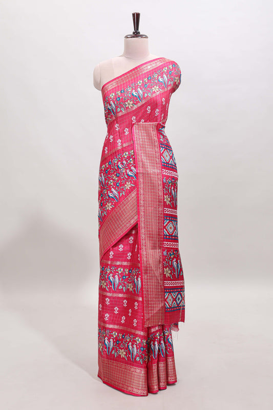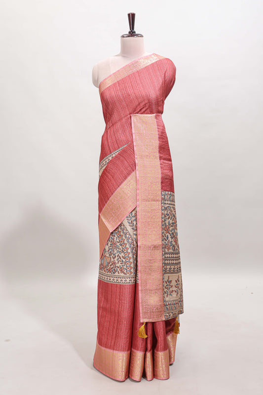 Pink kalamkari style art tussar saree with self zari border and blouse