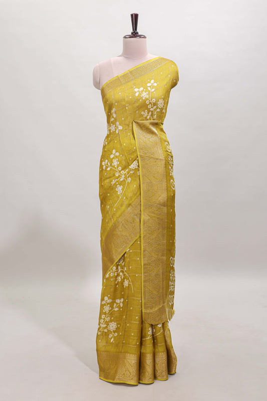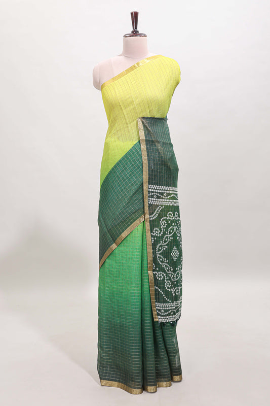 Yellow and green dual shade checked linen cotton saree with self zari border and matching blouse