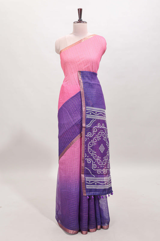 Pink and violet dual shade checked linen cotton saree with self zari border and matching blouse
