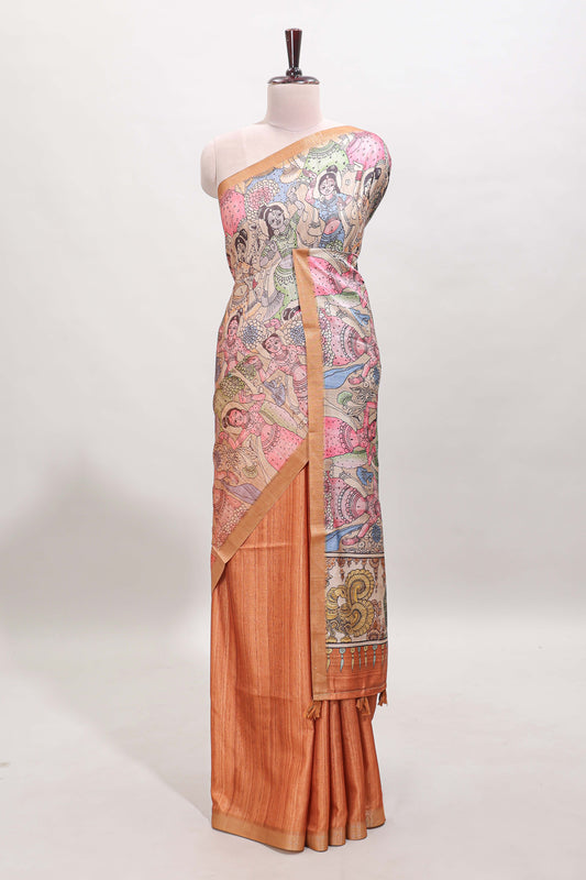 Peach soft silk vairaoosi saree with plain self border and contrast blouse