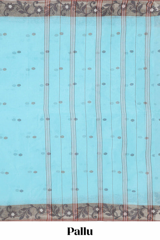 Blue butta design bengal cotton saree with contrast border and matching striped pallu