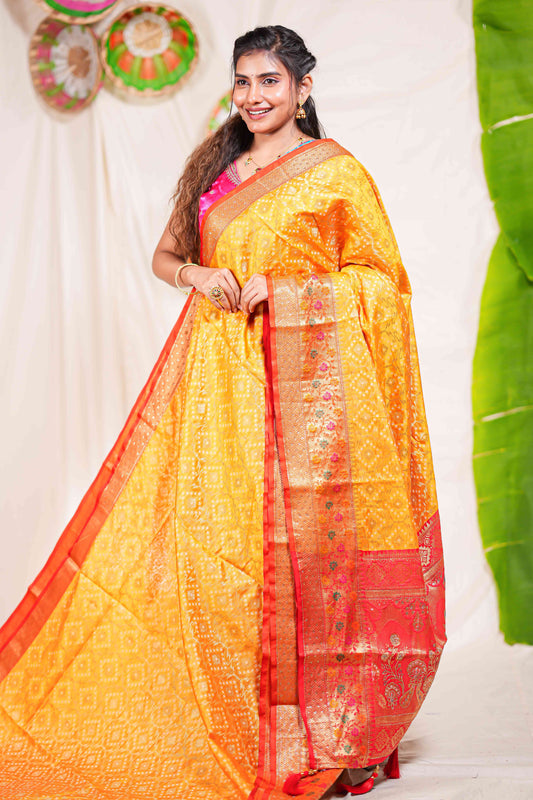 Yellow Chanderi Cotton Body and Pallu Kalamkari Print With Zari Border
