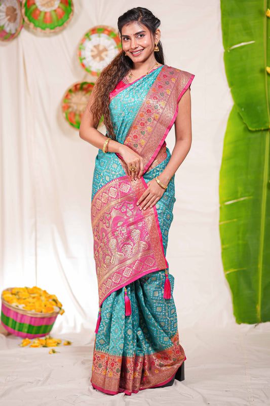 Turquoise blue dola silk birds and floral printed lehenga with contrast blouse and dhavani