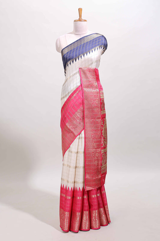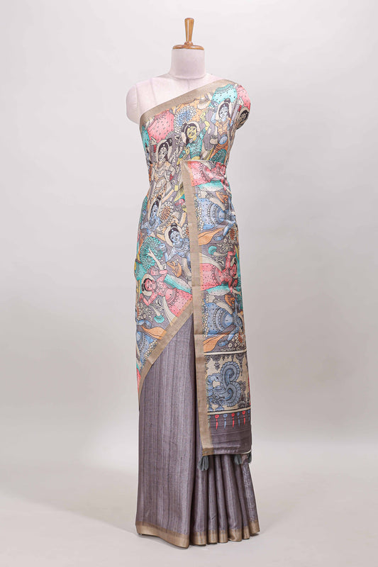 Grey traditional kalamkari style dola silk saree with contrast zari border and matching blouse