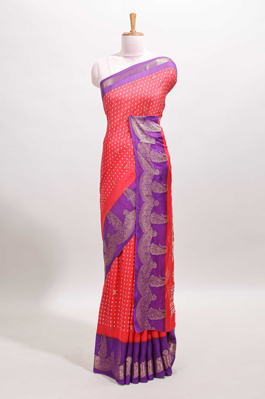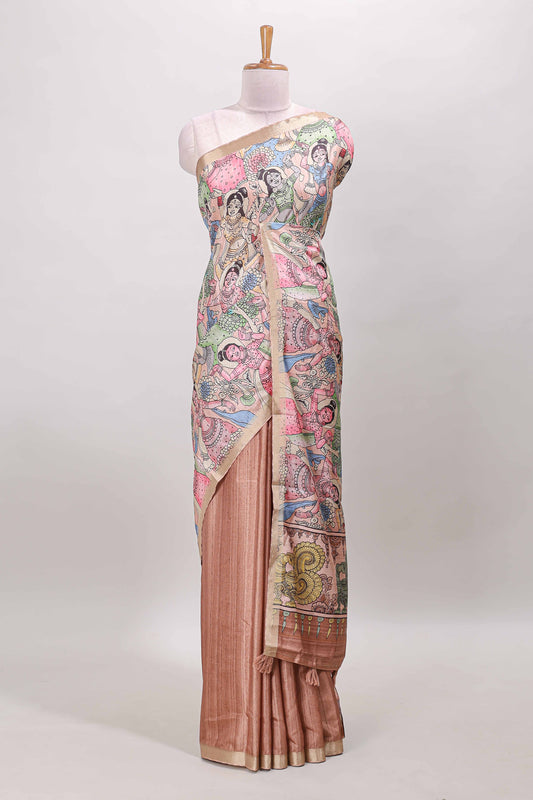 Orange traditional kalamkari style dola silk saree with contrast zari border and matching blouse