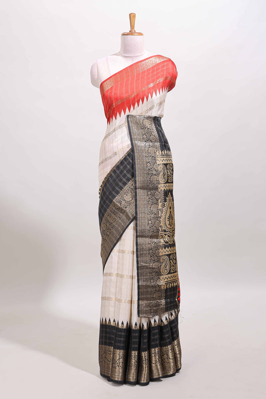 White geometric design ikkat style linen cotton saree with contrast border and striped blouse