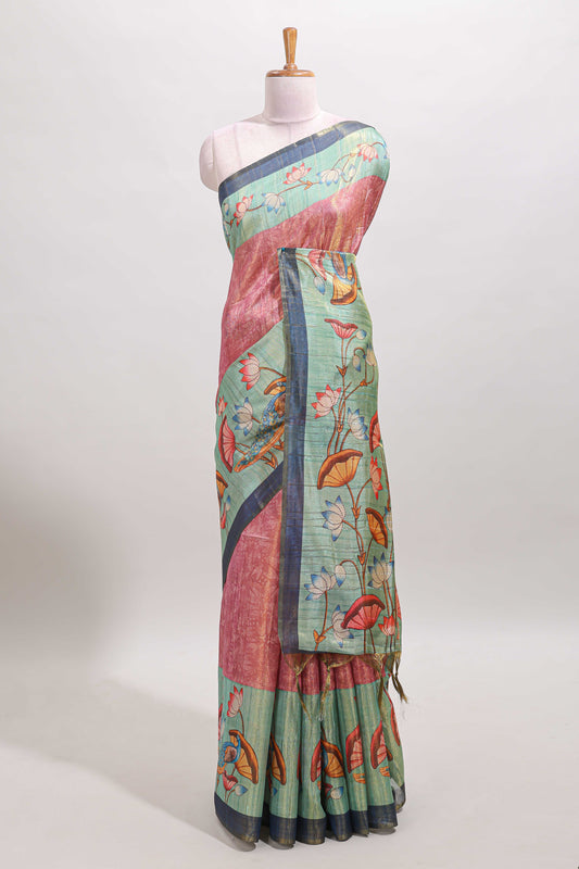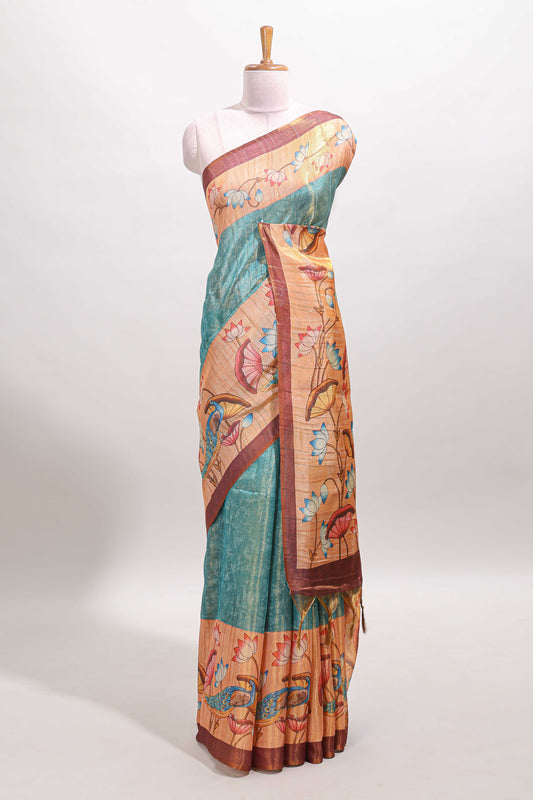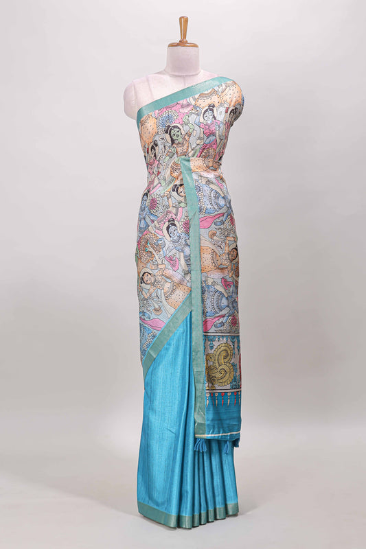 Turquoise blue traditional kalamkari style dola silk saree with contrast zari border and matching blouse