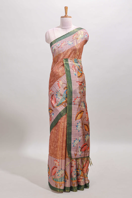 Borderless sandal floral and birds design munga cotton saree with floral and crane printed pallu and matching blouse