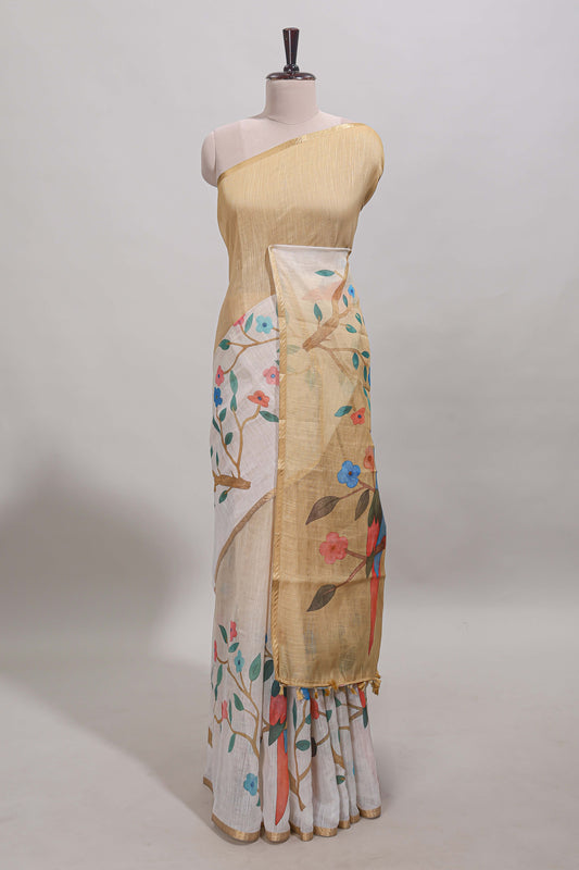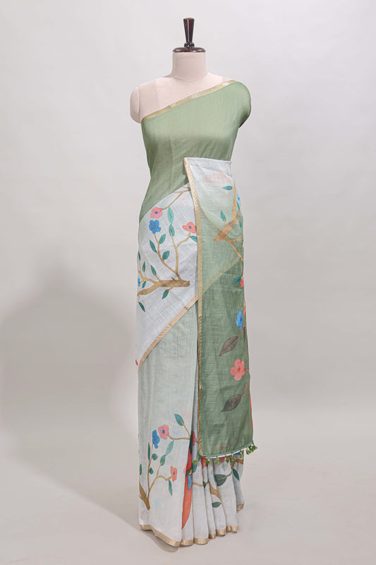 Beige linen cotton saree with green shibori print, self zari border and floral design pallu