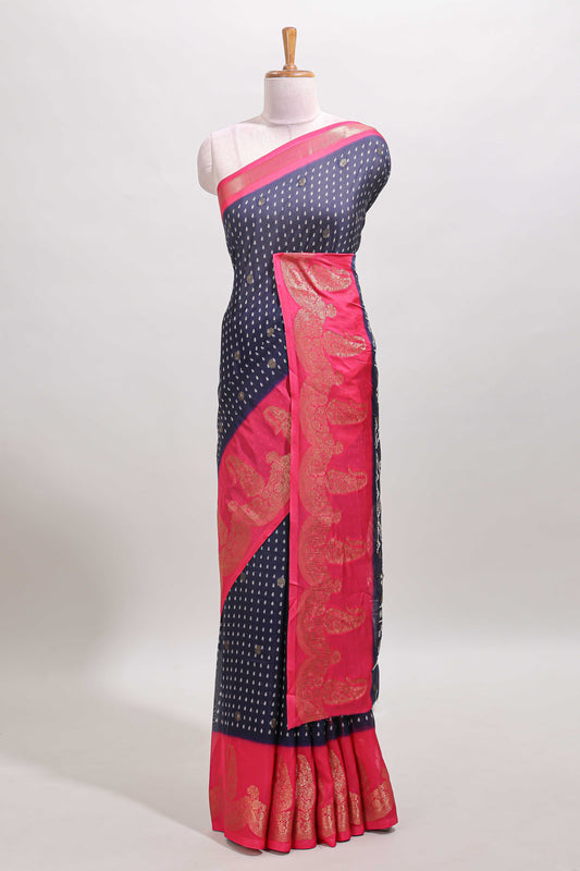 Navy blue geometric pattern & floral design masakali saree with self border and matching blouse