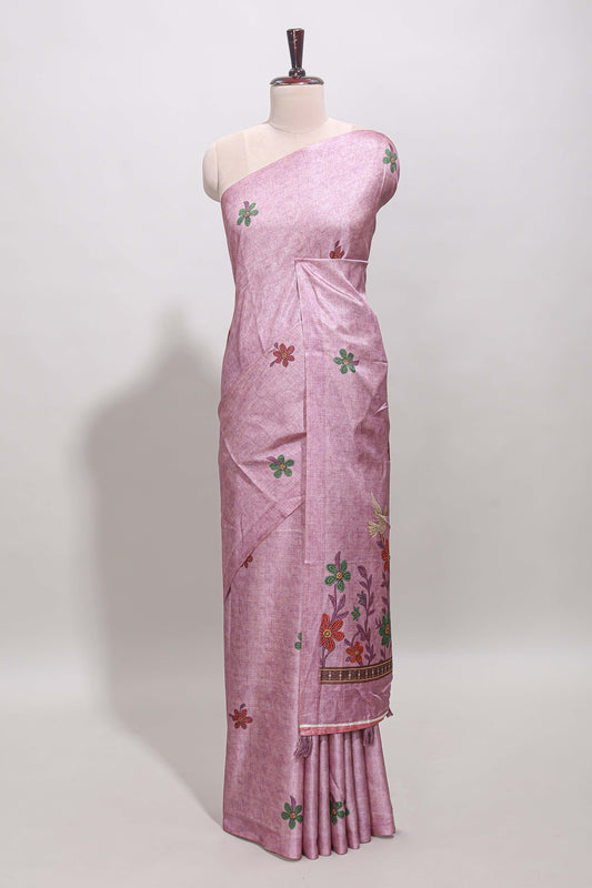 Borderless pink floral motifs art tussar saree with matching blouse and floral design pallu