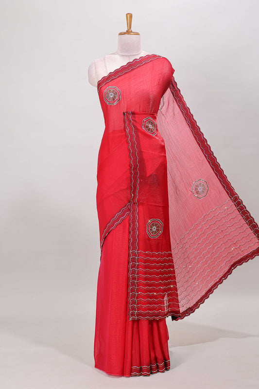 Pink stone work geometric design semi chiffon saree with self scallop border and matching blouse