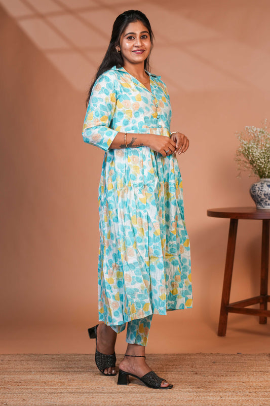 Blue floral printed A line anarkali 3/4th slevee with collar neck matching bottom