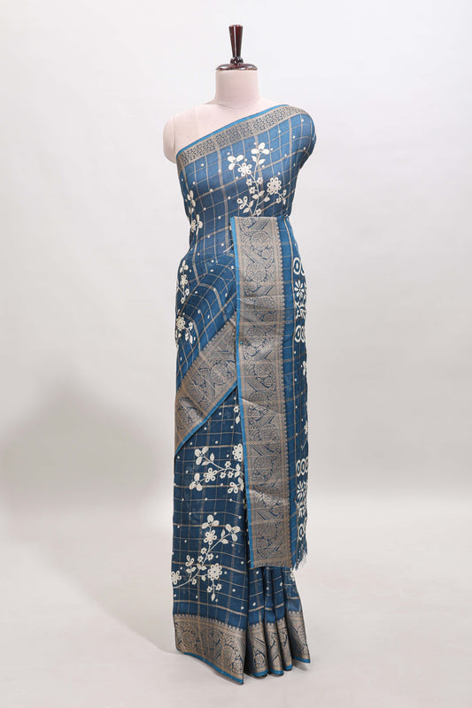 Blue checked floral design dola saree with self zari border and matching blouse