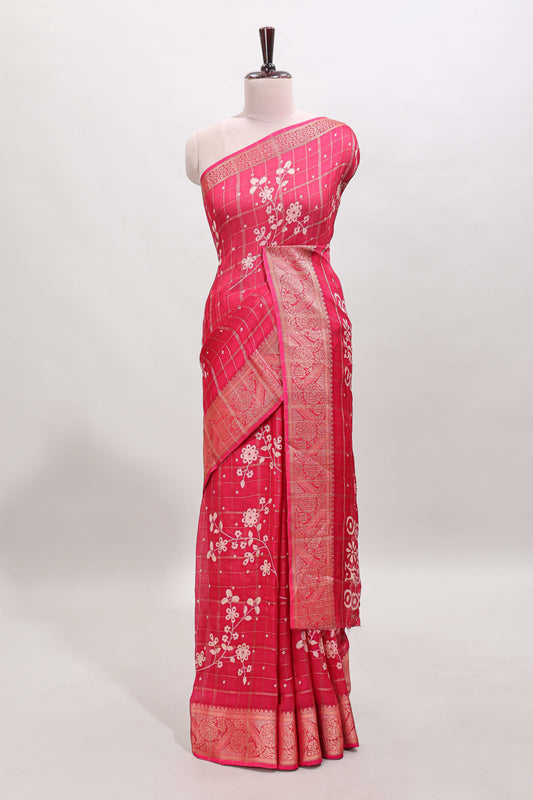 Rose red checked floral design dola saree with self zari border and matching blouse