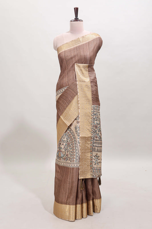 Brown ditsy floral print art tussar saree with contrast zari border and matching blouse