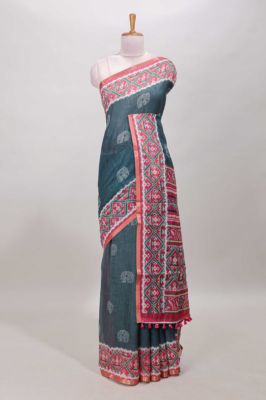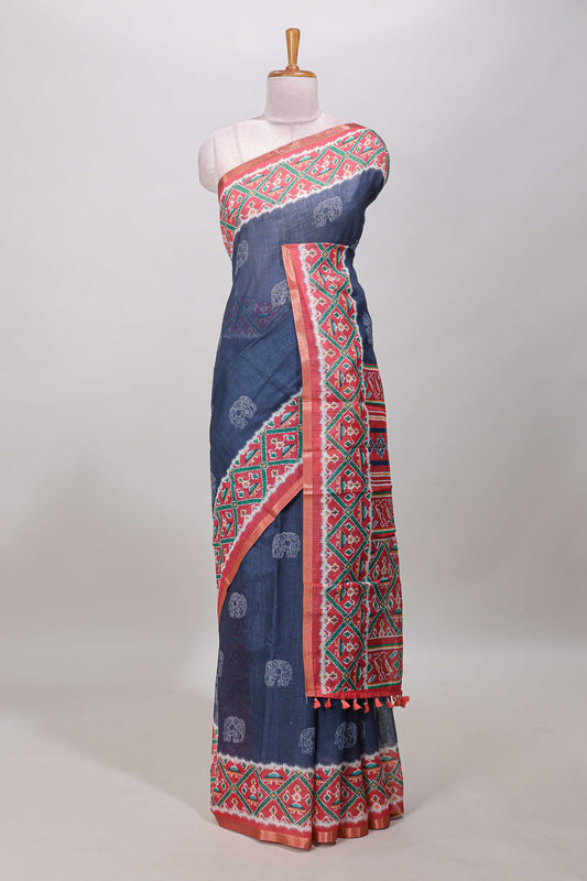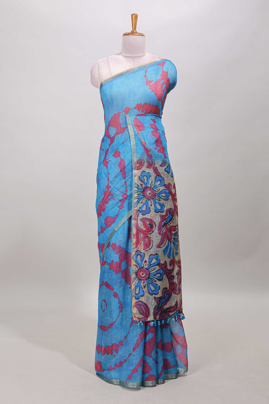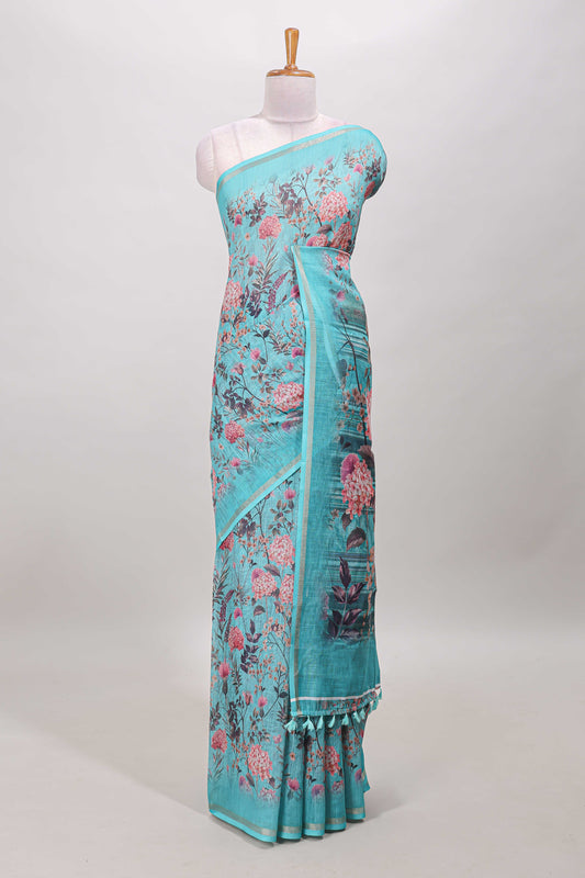 Blue floral design linen cotton saree with self zari border and matching pallu