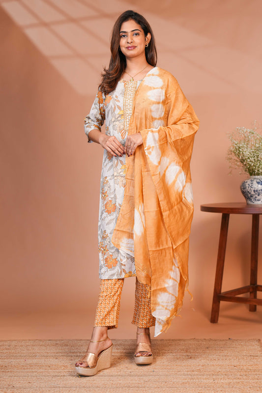 Orange floral design chamki work round neck salwar set with 3/4th sleeve, self bottom and matching dupatta