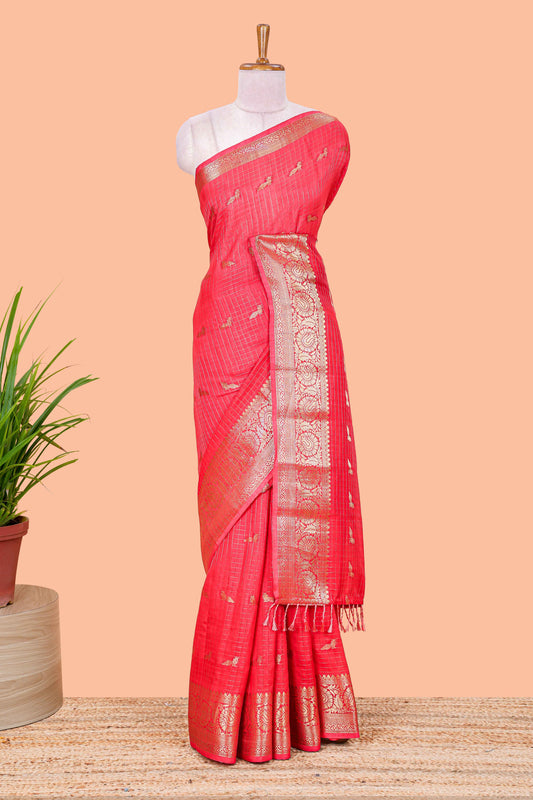 Pink checked peacock zari motifs dola silk saree with self zari border and matching blouse