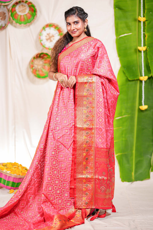 Pink art silk saree golden zari motifs body and paithani pallu along with blouse