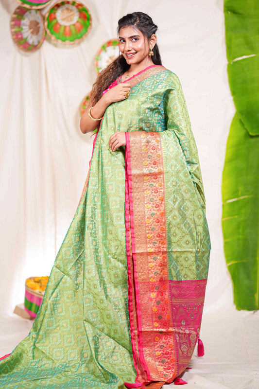 Green semi soft silk with striped pochampally ikkat design and contrast zari border