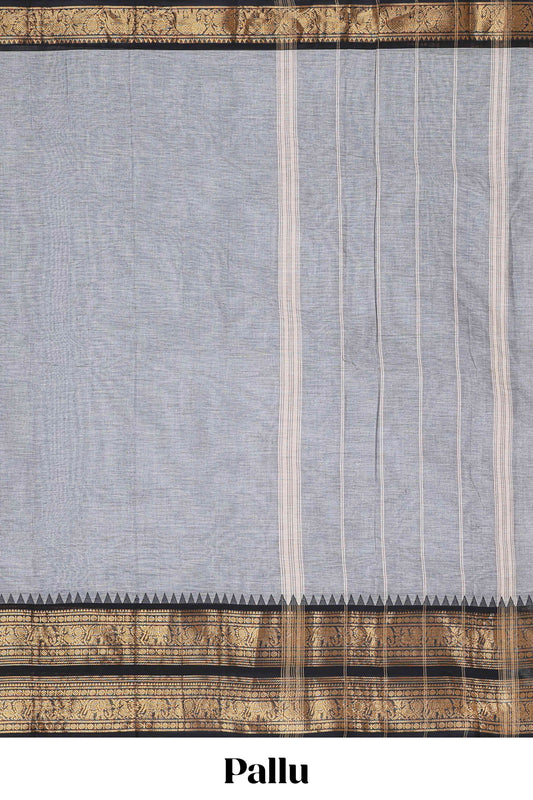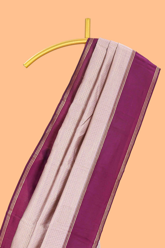 Beige plain narayanpet cotton saree with contrast border and striped pallu