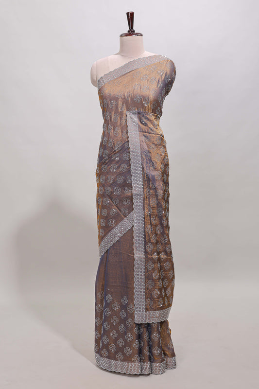 Sandal floral design stone work designer saree with self scallop border and matching blouse