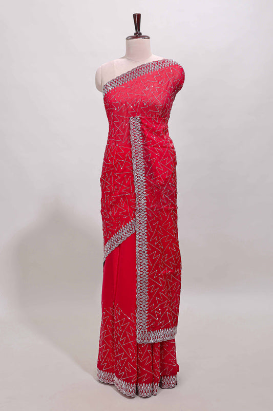 Pink geometric stone work designer saree with self scallop border and matching blouse