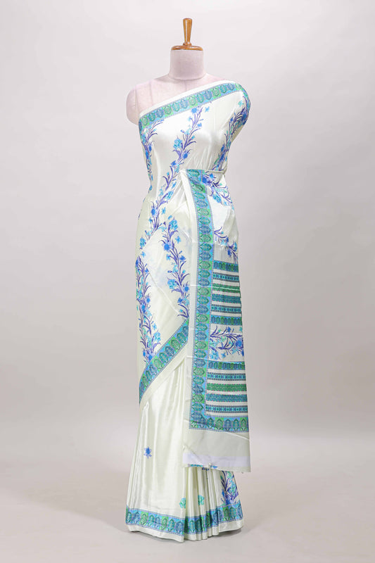 Cream floral print georgettte saree with self floral design border matching striped pallu
