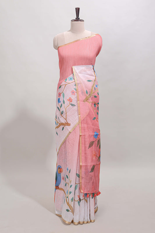 Pink thread woven warli design munga cotton saree with self border and matching blouse