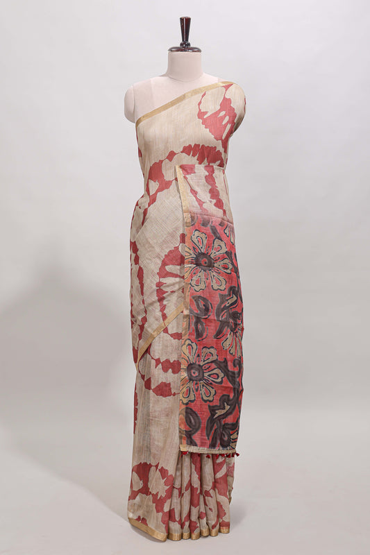 Beige linen cotton saree with red shibori print, self zari border and floral design pallu