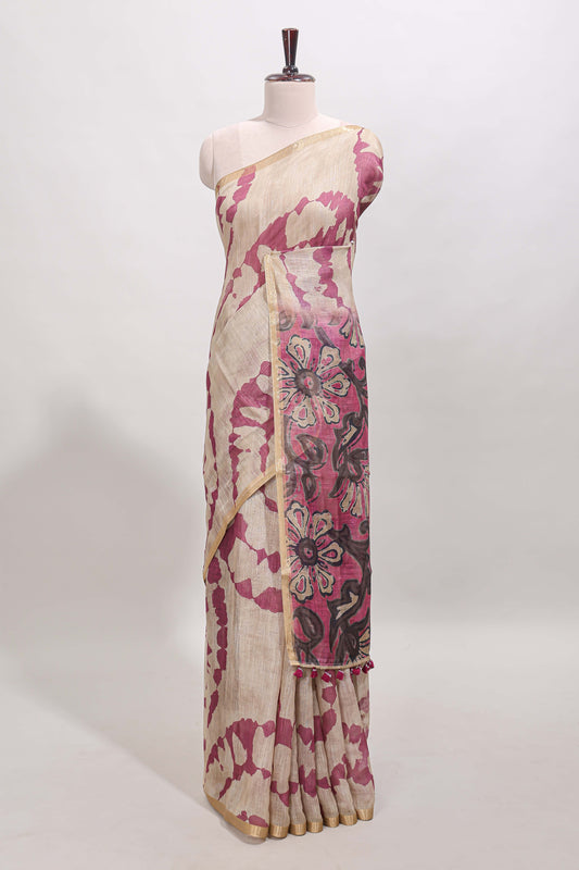 Beige linen cotton saree with violet shibori print, self zari border and floral design pallu