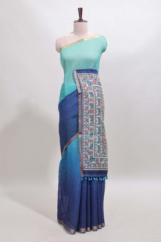 Turquoise blue checked geometric motifs linen cotton saree with contrast ikkat style border and blouse