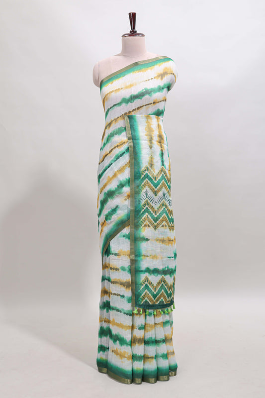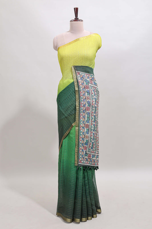 Green checked geometric motifs linen cotton saree with contrast ikkat style border and blouse