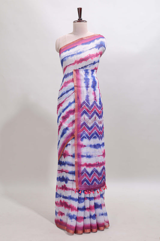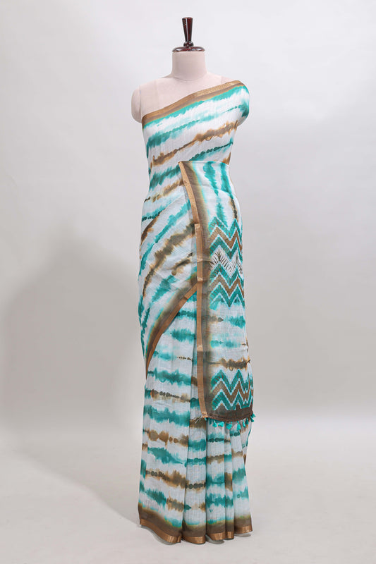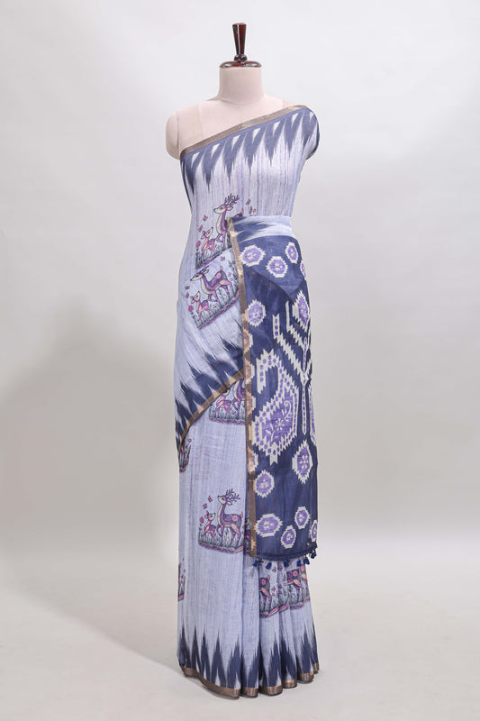 Blue floral design linen cotton saree with self zari border and matching blouse