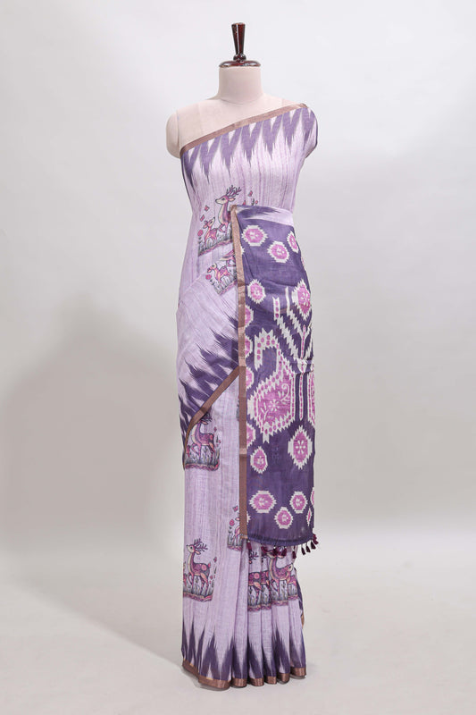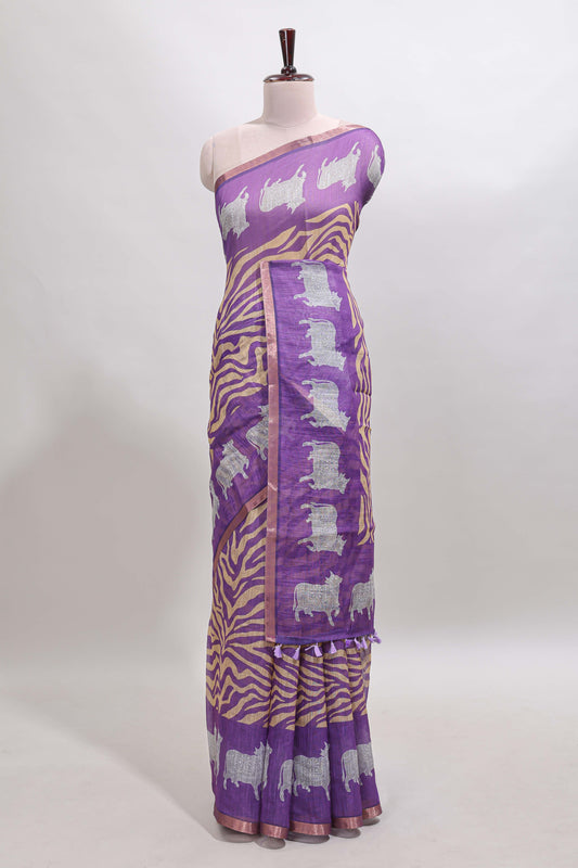 Purple checked geometric motifs linen cotton saree with contrast ikkat style border and blouse