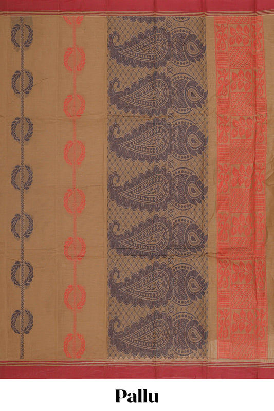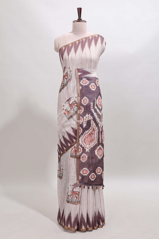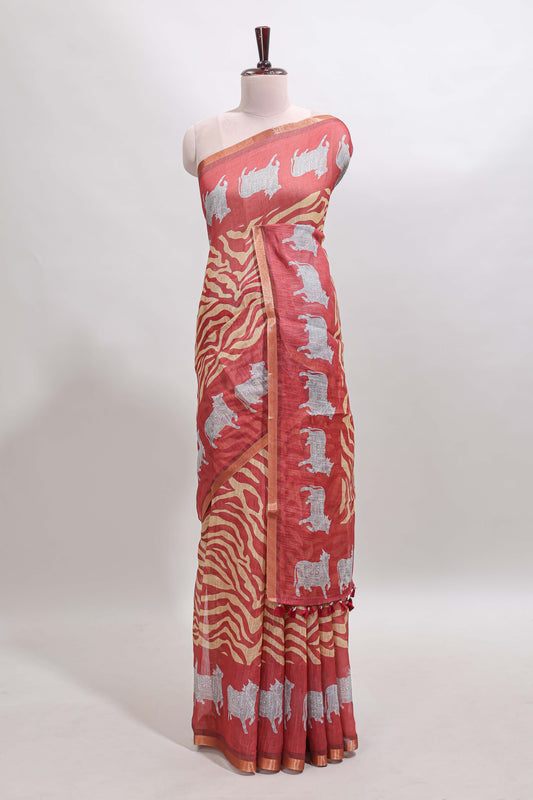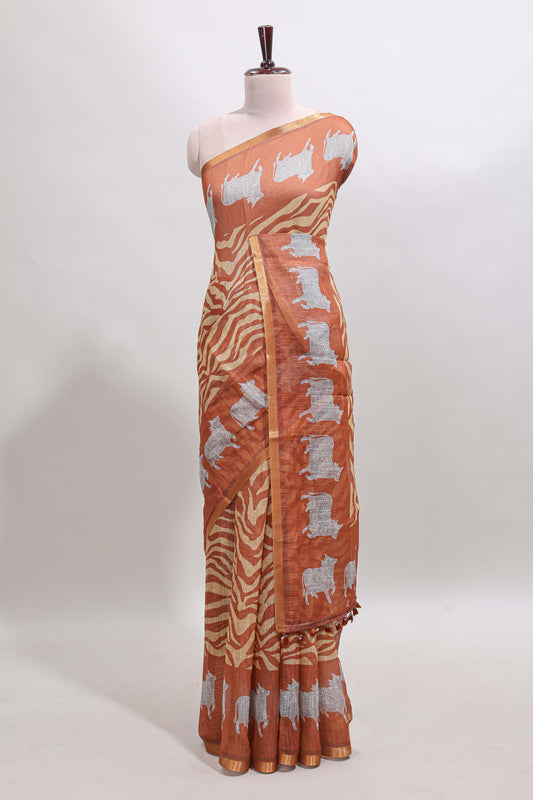Borderless sandal animal themed woven munga cotton saree with printed pallu and blouse