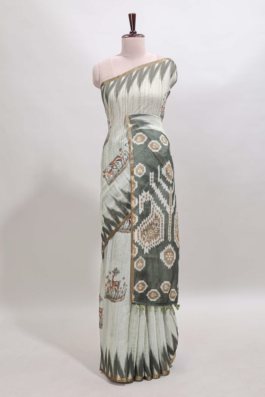 Grey floral design linen cotton saree with self zari border and matching blouse