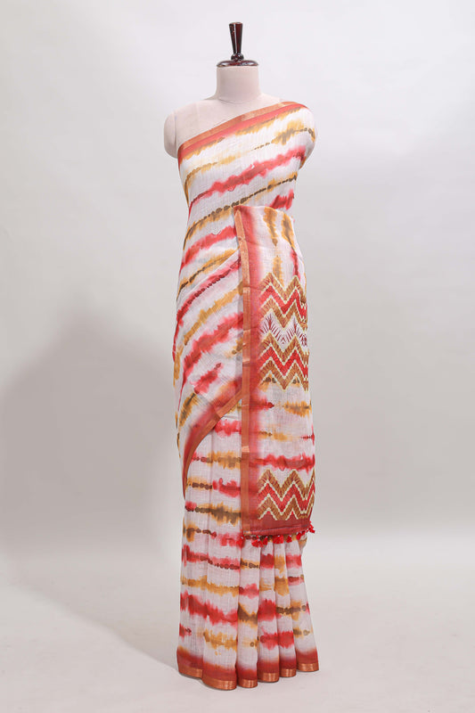 Beige floral design linen cotton saree with self zari border and matching blouse