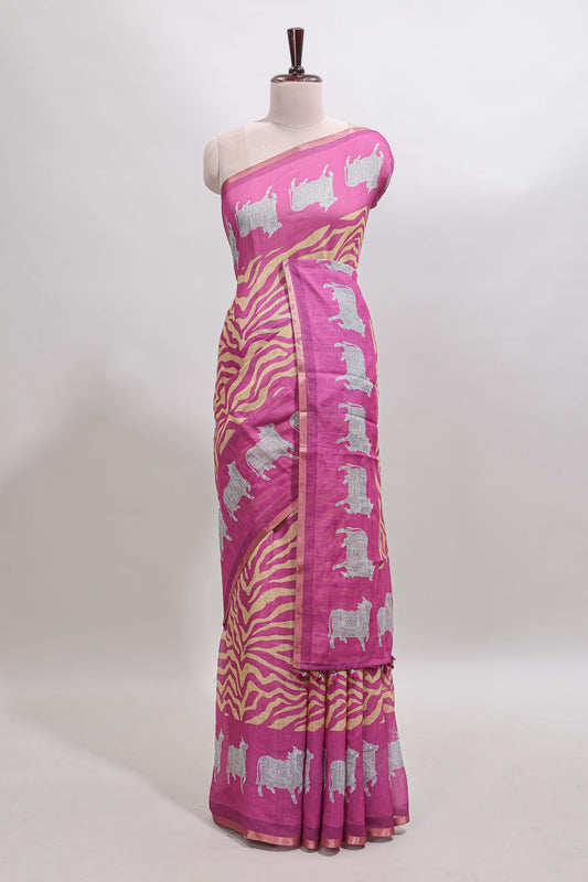 Pink floral design linen cotton saree with self zari border and matching blouse