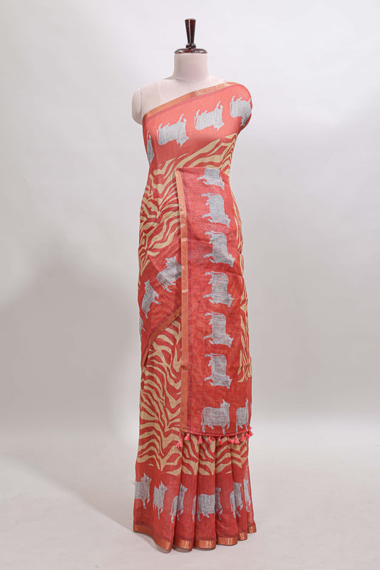 Red peacock & floral motifs linen cotton saree with contrast border and matching blouse