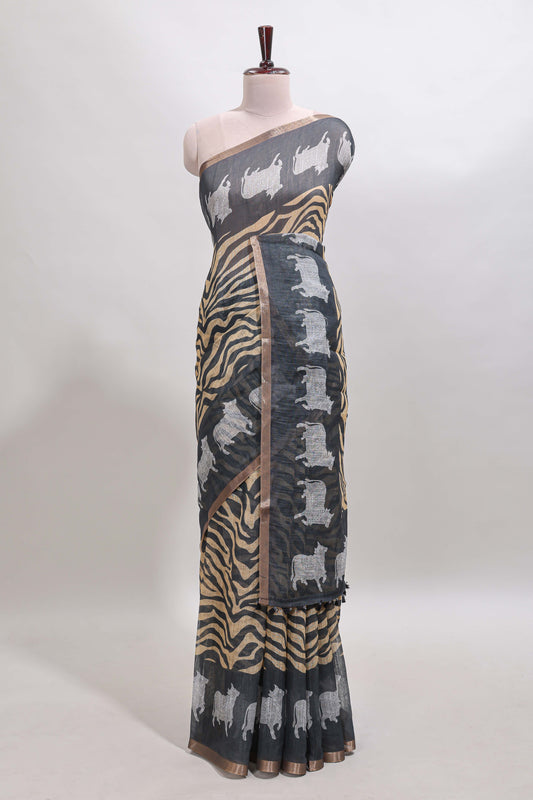 Grey striped chanderi cotton saree with forest theme print and zari stripe pallu