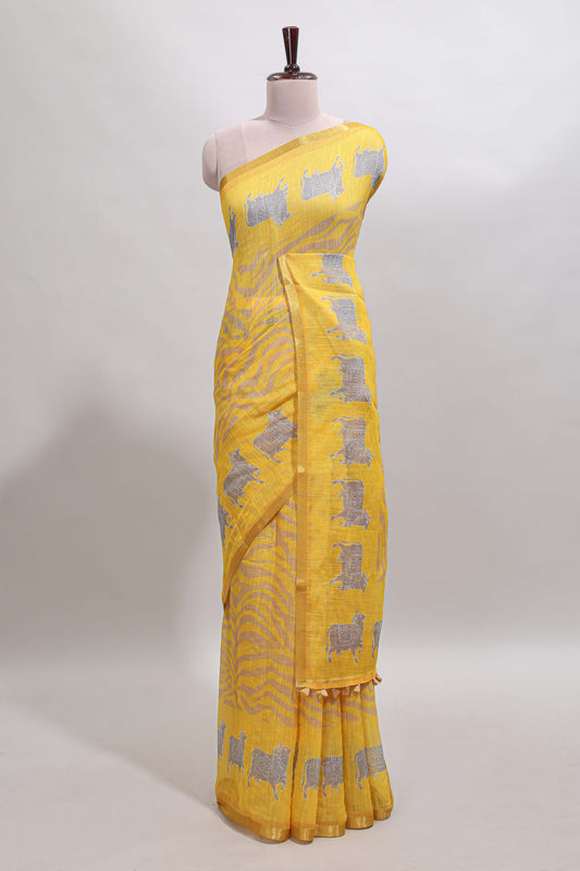 Yellow checked geometric motifs linen cotton saree with contrast ikkat style border and blouse