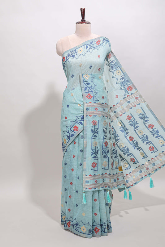 Blue floral motifs munga cotton saree with self border matching blouse