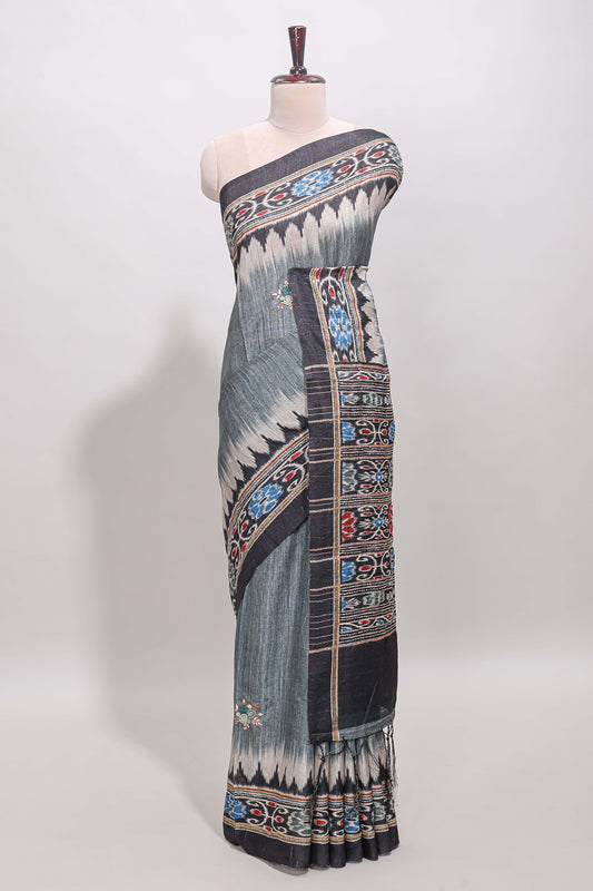 Grey ikkat style floral motifs tussar saree with contrast border and crane bird motif blouse