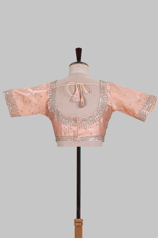 Peach floral design chamki work designer saree with self scallop border and matching blouse