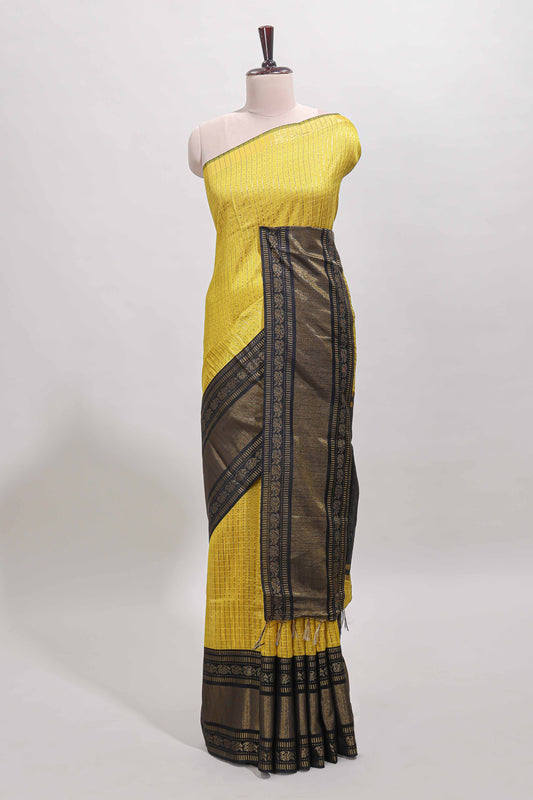 Yellow checked tussar saree with contrast black zari border and checked blouse