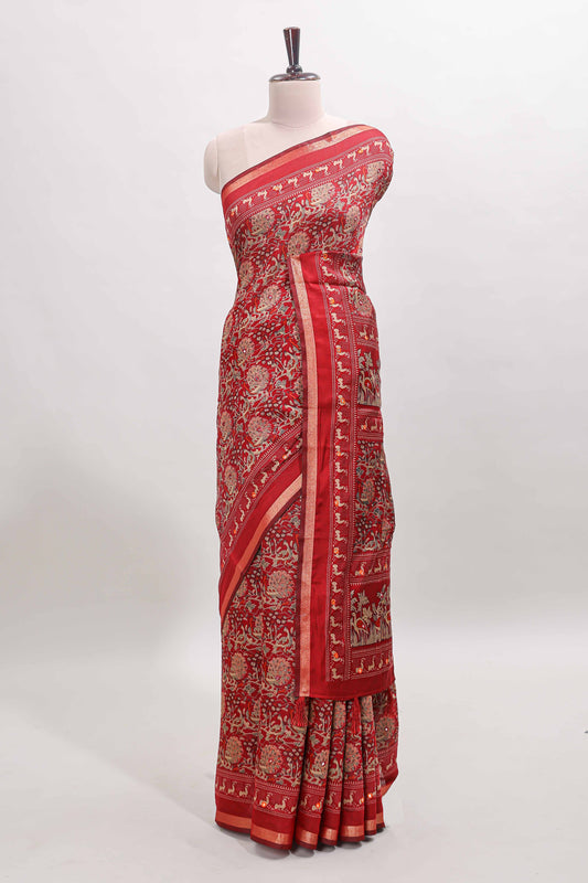 Red floral design motifs banarasi silk saree with contrast floral print border and matching blouse