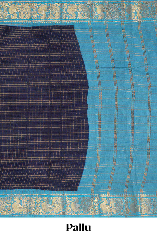 Navy blue checked sungudi cotton saree with contrast border and striped pallu